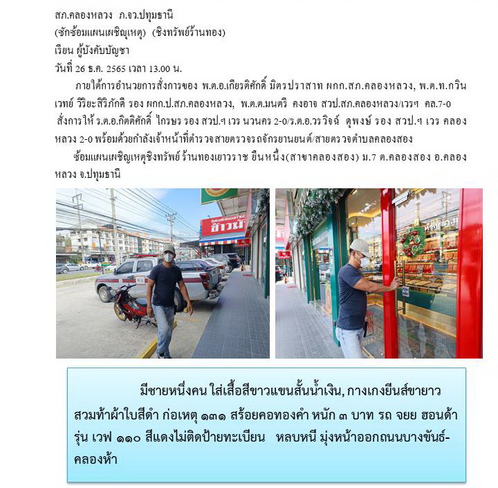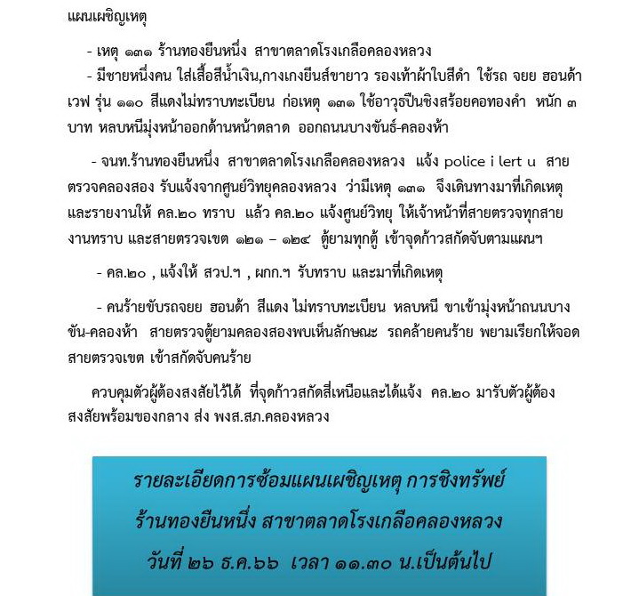 ซ้อมแผนเผชิญเหตุชิงทรัพย์ ร้านทองเยาวราช ยืนหนึ่ง(สาขาคลองสอง) ม.7 ต.คลองสอง อ.คลองหลวง จ.ปทุมธานี