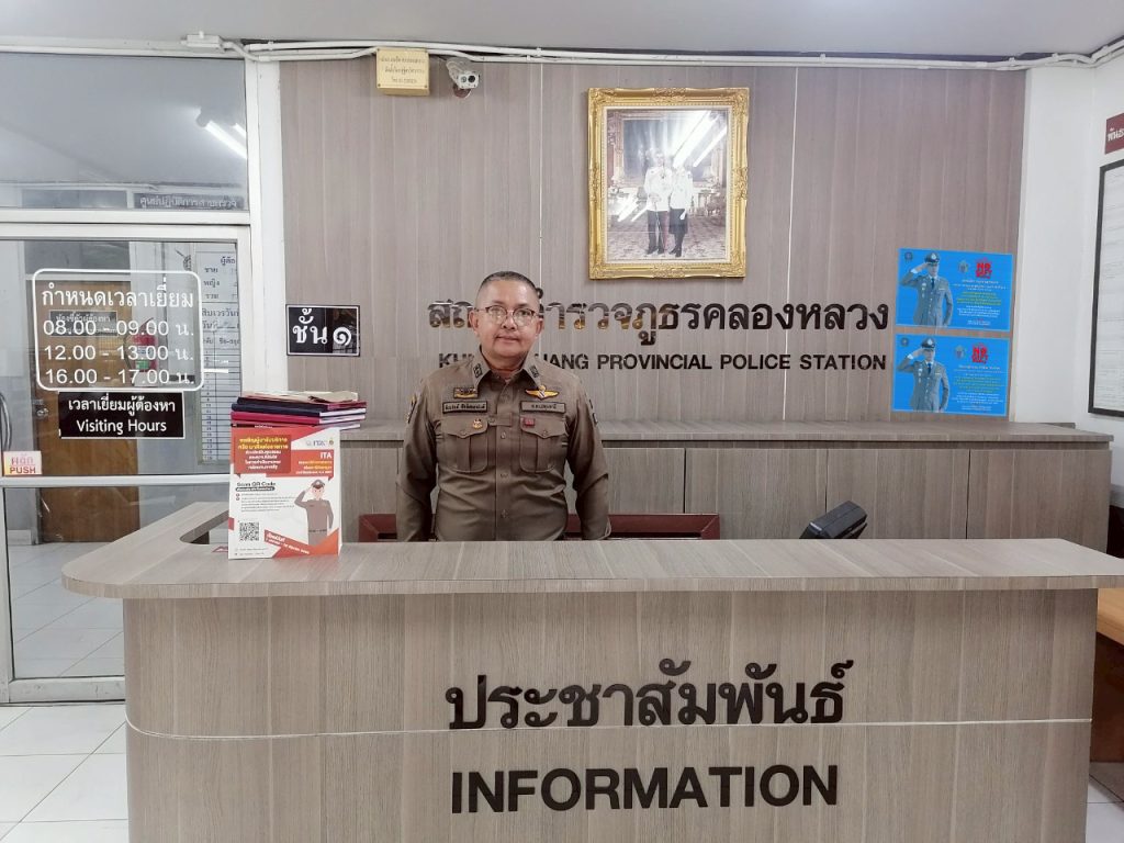 ประชาสัมพันธ์ (EIT) ตอบแบบประเมิน สำหรับประชาชนที่มาใช้บริการในสถานีตำรวจภูธรคลองหลวง ณ จุดประชาสัมพันธ์