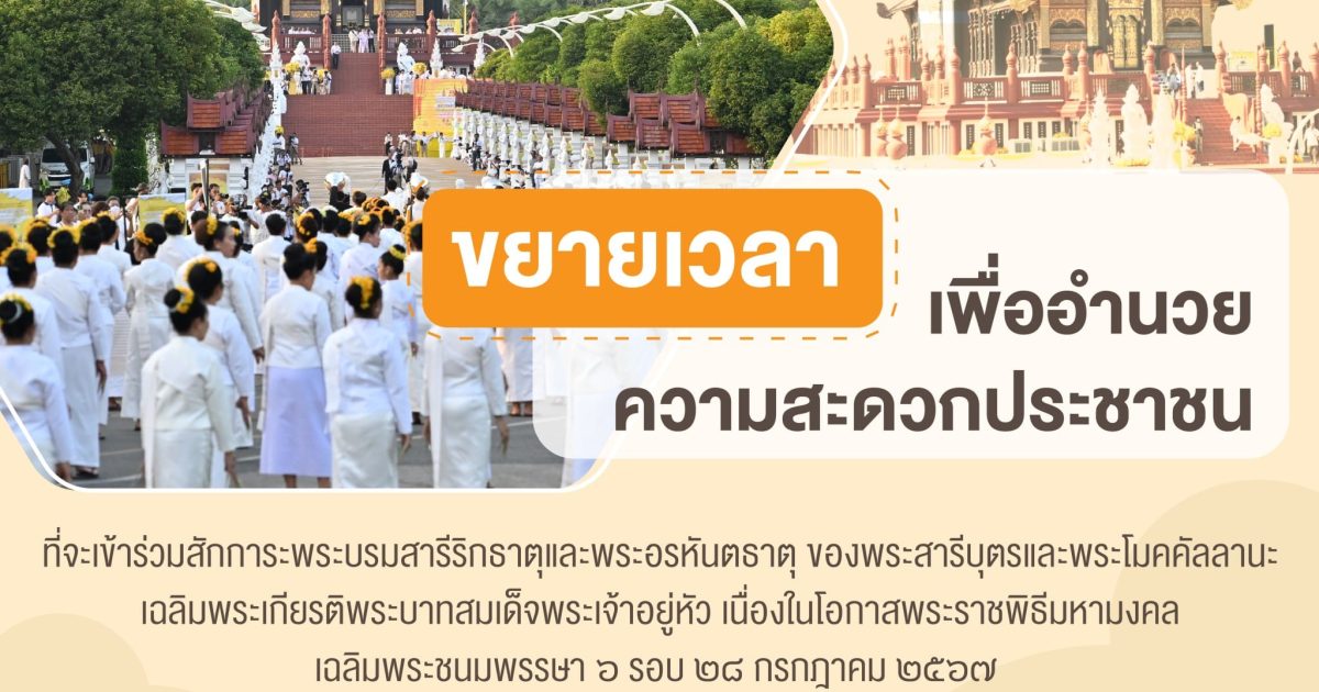 ขยายเวลาเพื่ออำนวยความสะดวกประชาชนที่จะเข้าร่วมสักการะพระบรมสารีริกธาตุและพระอรหันตธาตุ ของพระสารีบุตรและพระโมคคัลลานะ