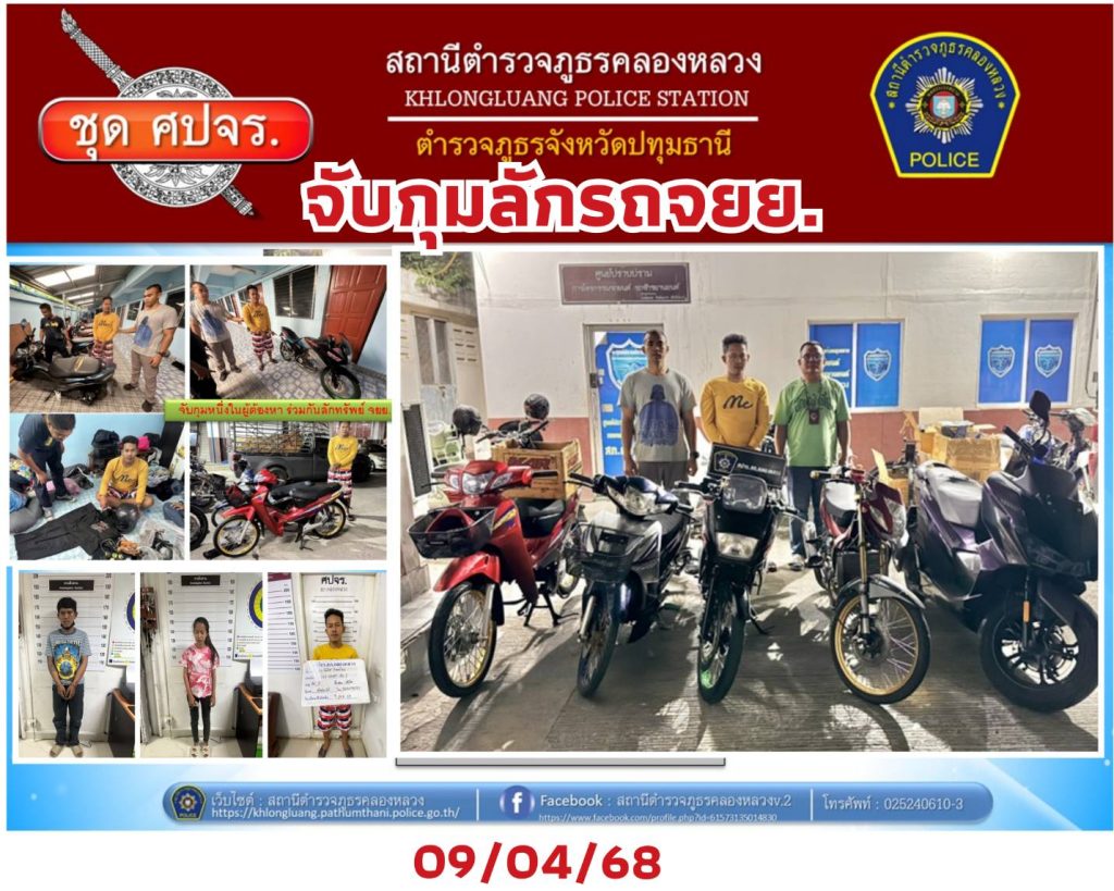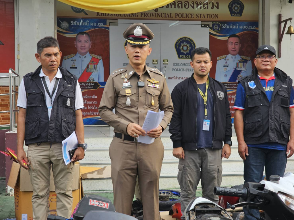 โดย พ.ต.อ.อธิเมศร์ ไชยศรัญวิชญ์ ผกก.สภ.คลองหลวง พ.ต.ท.ฉลาด หอมเงิน รอง ผกก.สส.สภ.คลองหลวง พ.ต.ท.ธนุส วิสุทธาภรณ์ สว.สส.สภ.คลองหลวง กำลังเจ้าหน้าที่ชุดสืบสวน และเจ้าหน้าที่ชุด ศปจร.สภ.คลองหลวง(ศูนย์ปราบปรามการโจรกรรมรถยนต์ รถจักรยานยนต์) ร่วมกันแถลงข่าวผลการจับกุมตัว