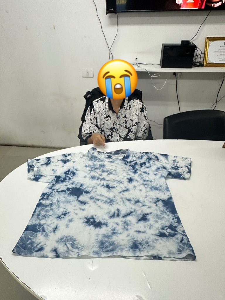 2. เสื้อยืดคอกลมแขนสั้น แบบมัดย้อม สีฟ้า – ขาว จำนวน 1 ตัว (สวมใส่ในการก่อเหตุ)