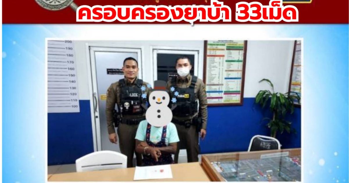 พร้อมของกลาง ยาบ้า 33 เม็ดตำแหน่งที่พบของกลาง บรรจุในถุงพลาสติกใส ใส่ในซองบุหรี่ยี่ห้อ VESS สีเเดง ในกระเป๋าผ้ากันเปื้อนที่สวมใส่ขณะตรวจค้น โดยกล่าวหาว่า 1.มียาเสพติดให้โทษประเภทที่ 1 เมทเเอมเฟตามีน(ยาบ้า)ไว้ในครอบครองโดยไม่รับอนุญาต