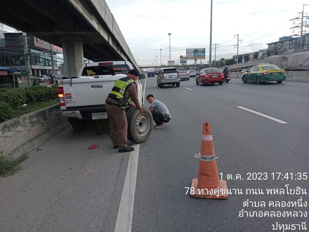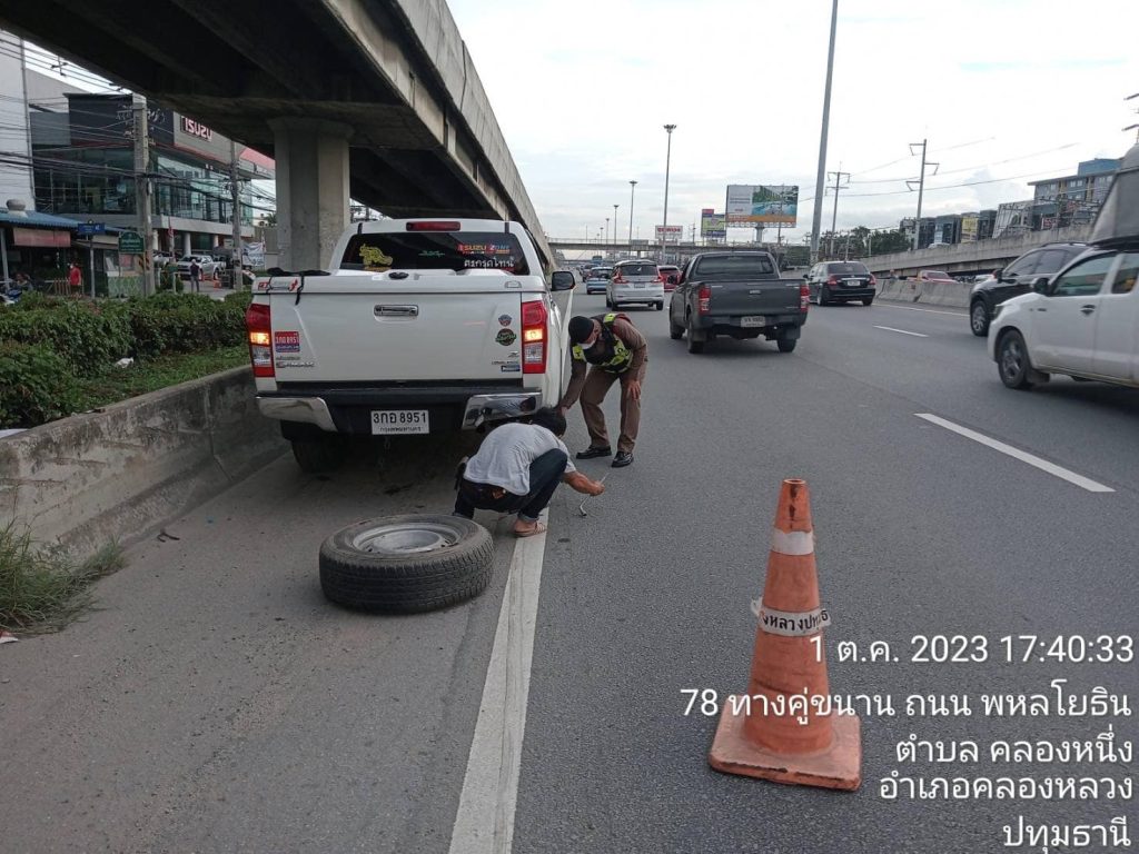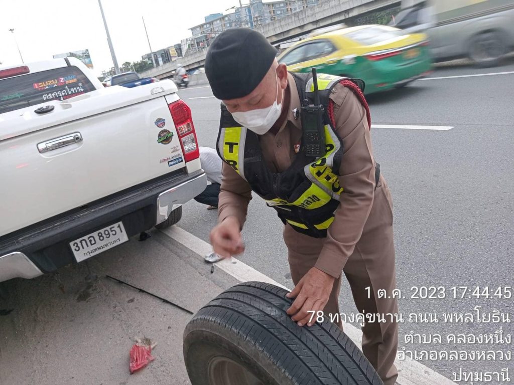 วันที่ 1 ต.ค.66 เวลาประมาณ 17.35 น. ขณะที่ ร.ต.อ.กันตพัฒน์ ปัสสา และ ร.ต.ท.โดม ฤทธิ์เดช เจ้าพนักงานจราจร สภ.คลองหลวงออกตรวจสภาพการจราจรในพื้นที่มาถึงบริเวณถนนพหลโยธินช่องทางด่วนขาเข้า กทม. จุดกลับรถเเก้วนิมิตรได้พบเหตุประชาชนผู้ใช้เส้นทางได้รับความเดือดร้อนโดยรถยนต์ที่ขับขี่มาเกิดขัดข้องยางรั่ว จึงรีบเข้าให้การช่วยเหลืออำนวยการจราจรและช่วยเหลือในการเปลี่ยนยางอะไหล่ จนสามารถขับขี่ต่อไปได้อย่างปลอดภัย