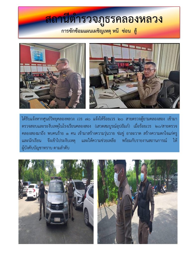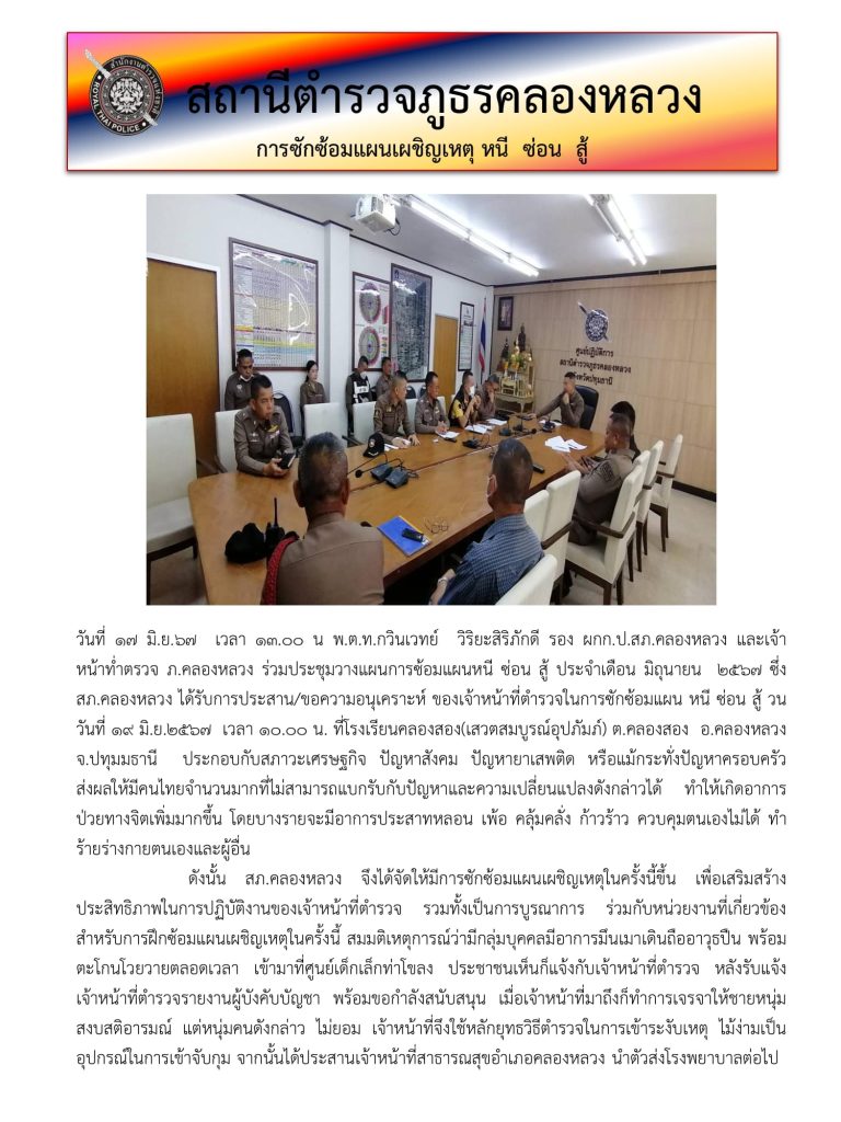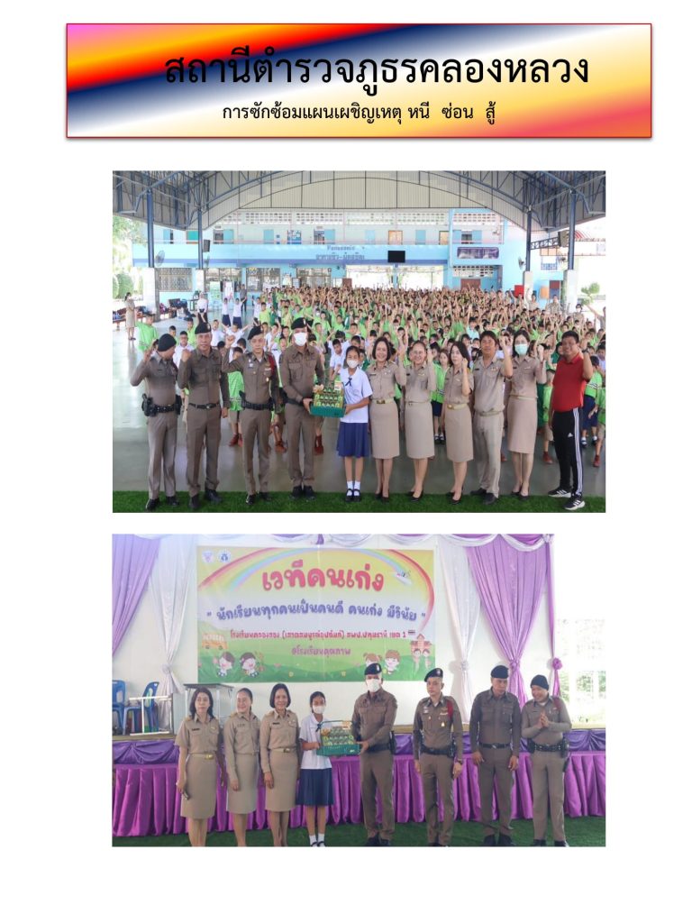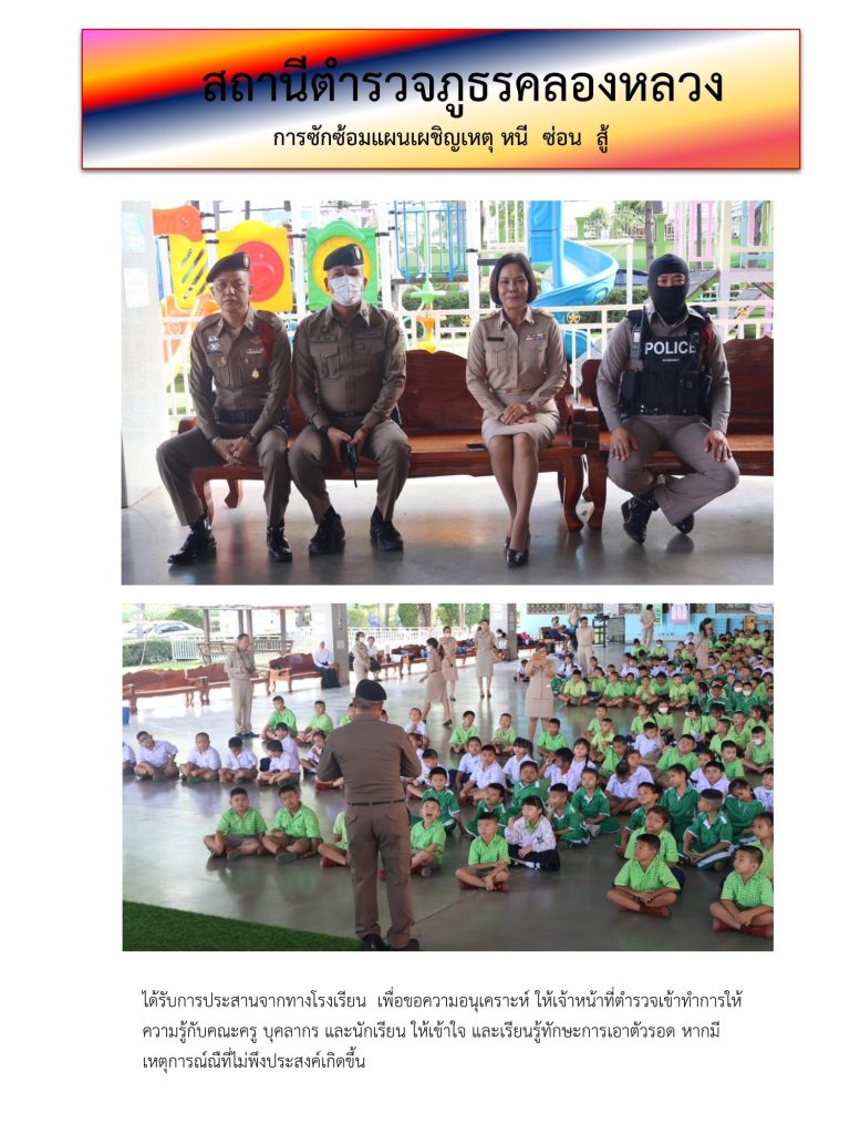 วันนี้ 19 มิถุนายน 2567 เวลา 10.00 – 11.00 น. พ.ต.อ.เกียรติศักดิ์ มิตรปราสาท ผกก.สภ.คลองหลวง , พ.ต.ท.กวินเวทย์ วิริยะสิริภักดี รอง ผกก.ป.ฯ พร้อมด้วยข้าราชการตำรวจงานป้องกันปราบปรามฯ โดย ร.ต.ต.โกวิทย์ ขวัญมงคล รอง สว(ป) สภ.คลองหลวง เป็นวิทยากร ดำเนินการฝึกอบรมถ่ายทอดความรู้ หากมีเหตุการณ์ที่มีบุคคลวิกลจริต เข้ามาเอะอะ โวยวายอาละวาด ในโรงเรียน ดำเนินการฯ โดยมีวัตถุประสงค์ ดังนี้