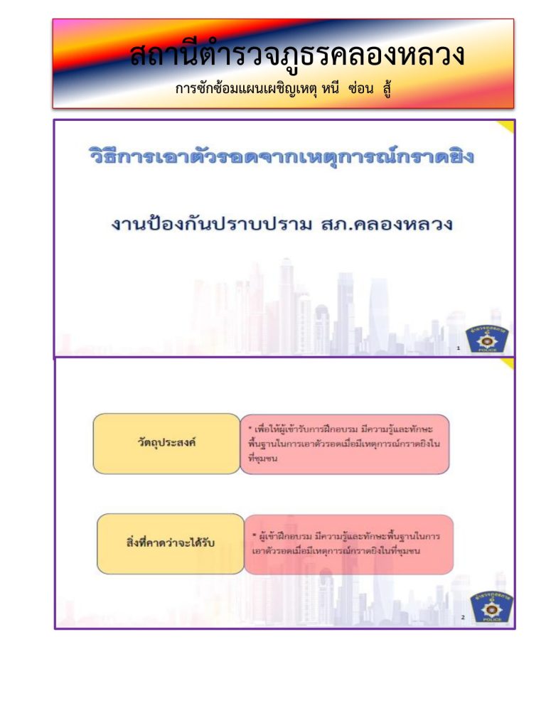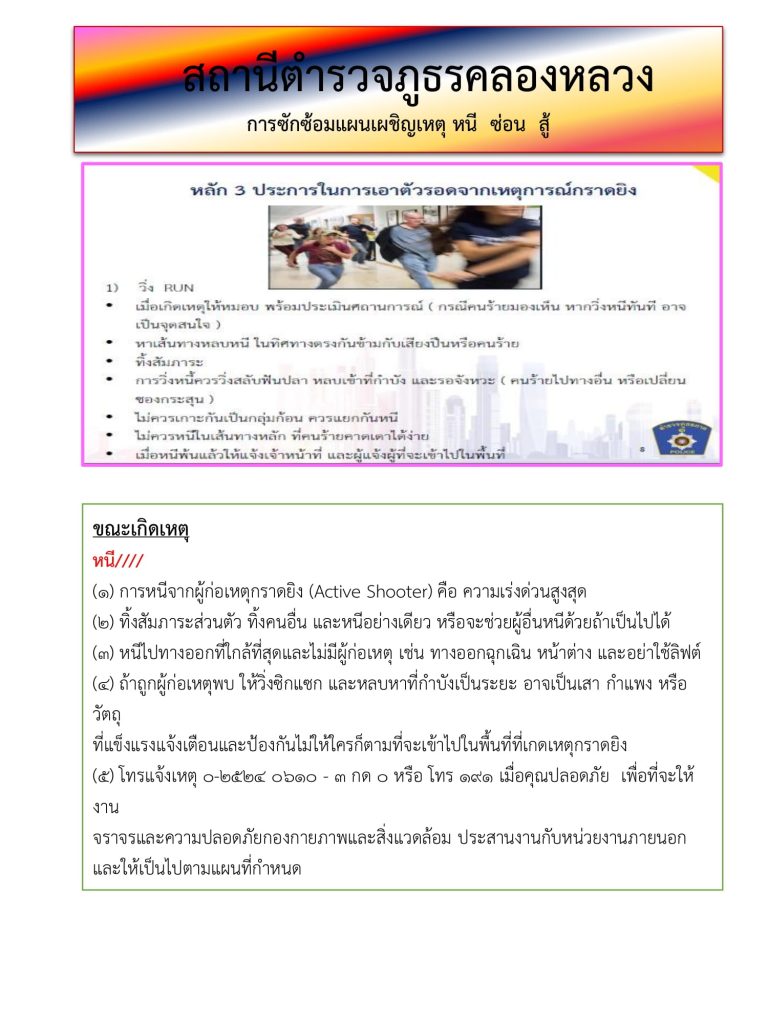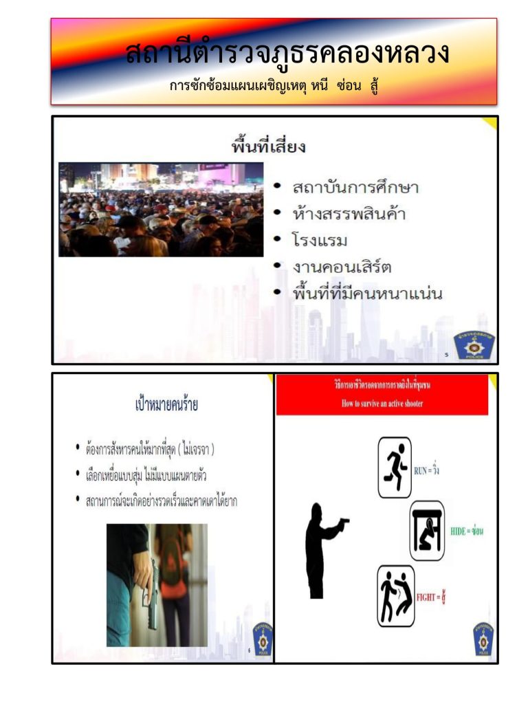 3. เพื่อเรียนรู้และเข้าใจ ในการรับมือในสถานการณ์ การกราดยิงหรือใช้อาวุธอย่างอื่น โดยมีหลักการ การวิ่ง การซ่อน การสู้