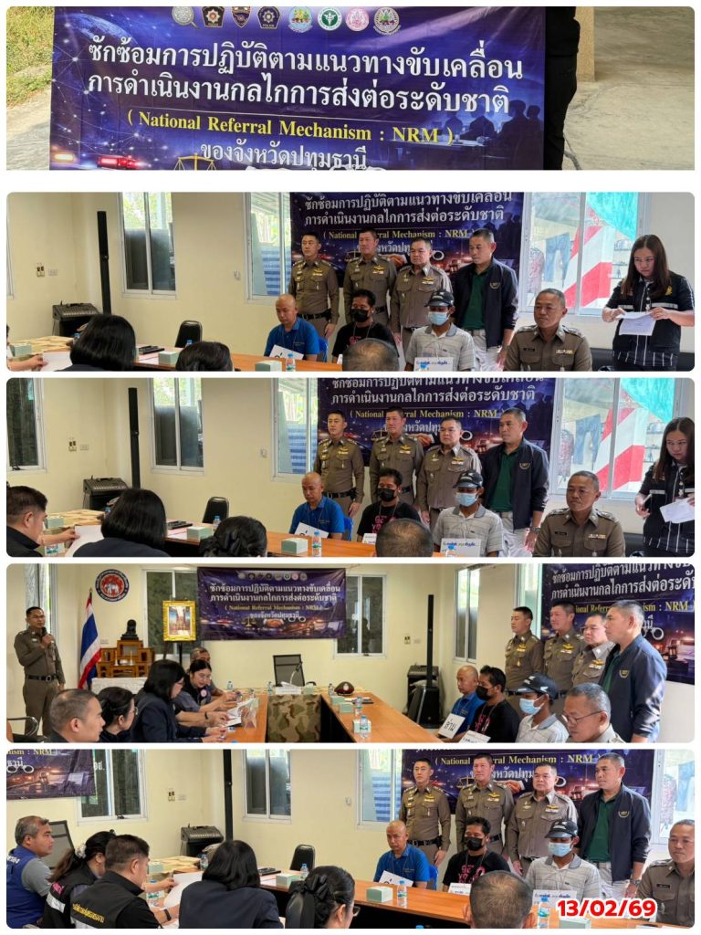 วันนี้ (13 ก.พ. 2569) เวลา 10.00 น. พล.ต.ต.พีรพล โชติกเสถียร ผบก.ภ.จว.ปทุมธานี เป็นประธานเปิดกิจกรรมซักซ้อมการปฏิบัติตามแนวทางขับเคลื่อนการดำเนินงานกลไกการส่งต่อระดับชาติ หรือ National Referral Mechanism : NRM ณ กองร้อยบังคับการและบริการกองอาสารักษาดินแดน อำเภอคลองหลวง จังหวัดปทุมธานี