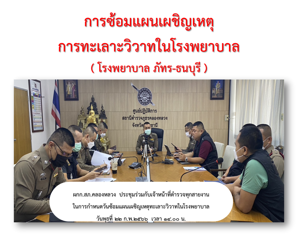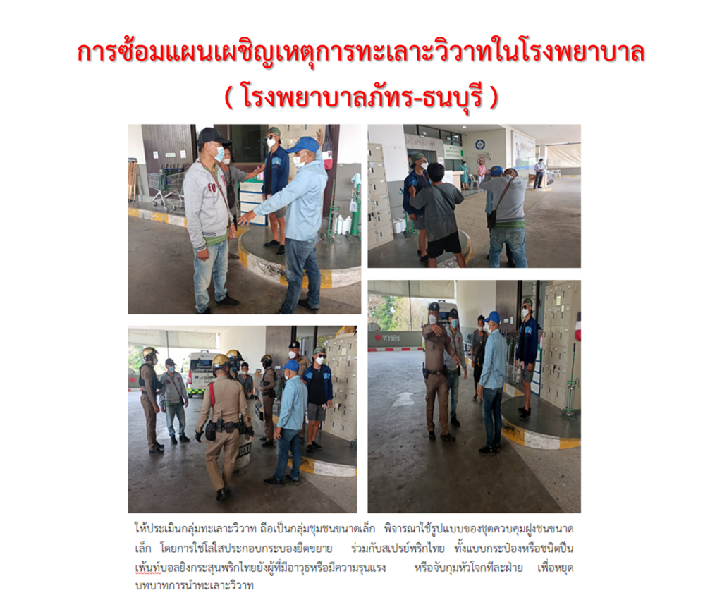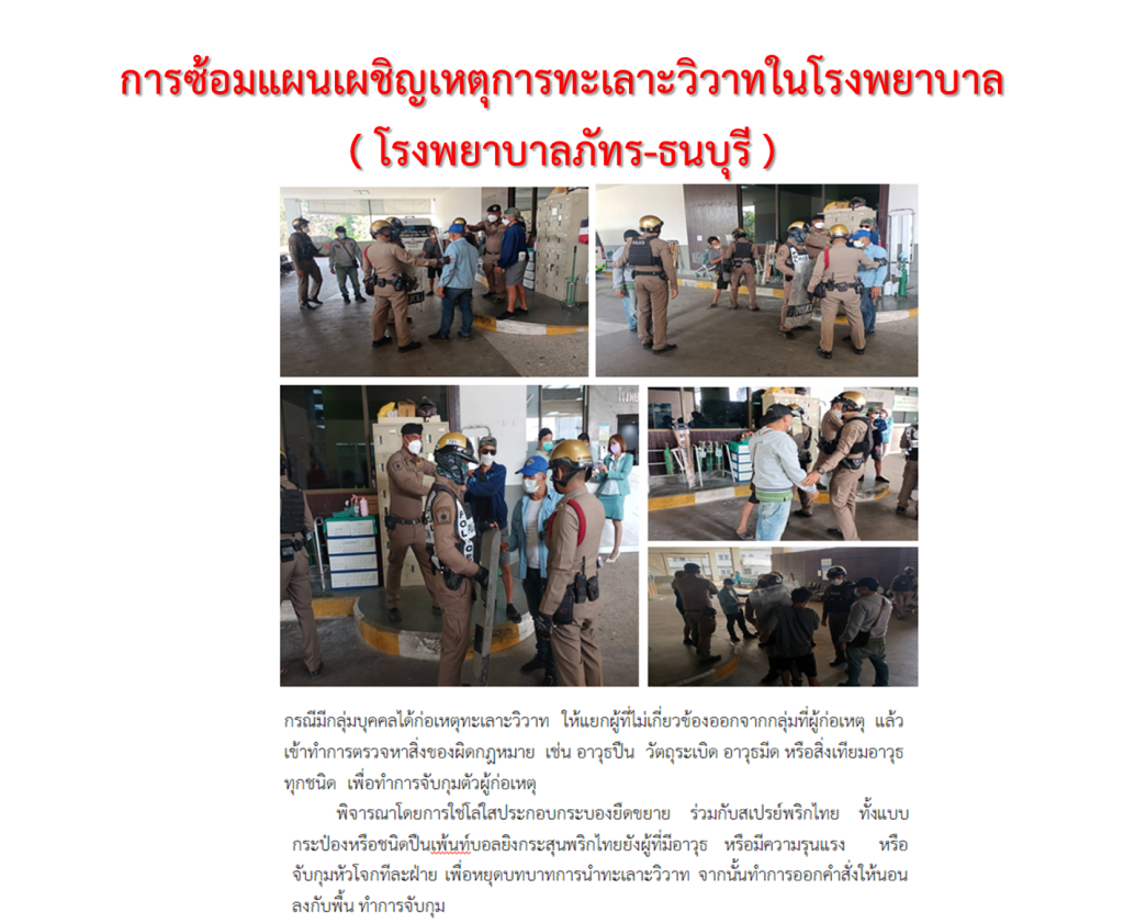 - ทำการฝึกทบทวนยุทธวิธีตำรวจ ซ้อมแผนเผชิญเหตุทำร้ายกันโรงพยาบาล