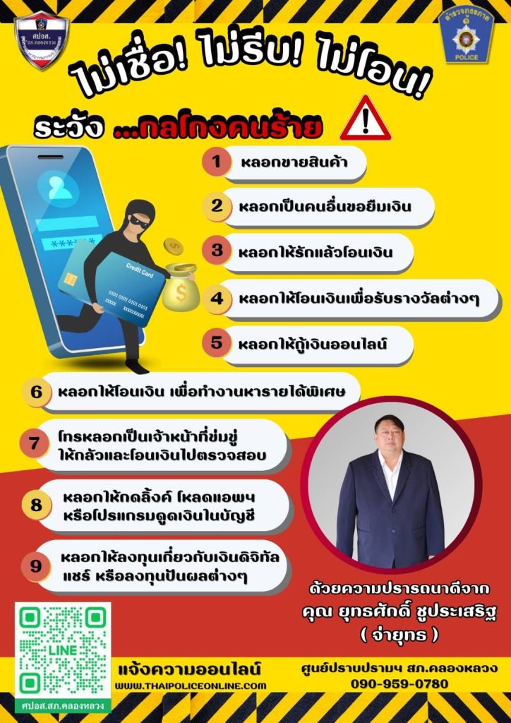 นายยุทธศักดิ์ ชูประเสริฐ ประธาน กต.ตร.สภ.คลองหลวง กล่าวว่าเนื่องจากในเขตของอำเภอคลองหลวงในความรับผิดชอบของ สภ.คลองหลวง นั้นมีการแจ้งความคดีถูกหลอกลวงทางออนไลน์เดือนหนึ่งประมาณ 8,000 คดีซึ่งเป็นยอดสูงสุดของประเทศแต่เนื่องจากมีประชากรพักอาศัยอยู่เยอะและประชากรแฝงหลายแสนคน ตนและคณะ กต.ตร สภ.คลองหลวง จึงร่วมกันสนับสนุนการประชาสัมพันธ์ป้องกันเหตุในหลายช่องทาง เช่นการอบรมให้ความรู้การทำโปสเตอร์ติดและแจกประชาสัมพันธ์ให้ความรู้แก่ประชาชนกลุ่มเสี่ยง โดยเฉพาะผู้สูงอายุ ที่อาจจะตกเป็นเหยื่อแก๊งมิจฉาชีพหลอกให้บอกเลขบัญชีหรือเลขบัตรประชาชนหรือบุคคลในบ้าน โดยการเชิญประธานหมู่บ้านประธานชุมชนให้มาช่วยกันออกให้ความรู้กับประชาชนพร้อมทั้งสืบหาข้อมูลหากจุดไหนหลอกลวงเยอะจากสถิติการรับแจ้งความก็จะลงไปแก้ไขประชาสัมพันธ์ให้ความรู้จุดนั้นเป็นการด่วน