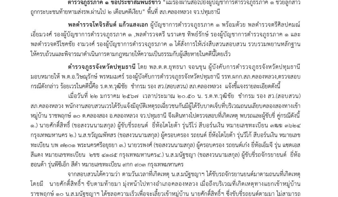 ตำรวจภูธรภาค ๑ ขอประชาสัมพันธ์ข่าว “แม่ร้องผ่านสื่อไปยังผู้บัญชาการตำรวจภูธรภาค 1 ช่วยลูกสาวถูกกระบะชนท้ายหามส่งรพ.ผ่านไป 2 เดือนคดีเงียบ” พื้นที่ สภ.คลองหลวง จว.ปทุมธานี