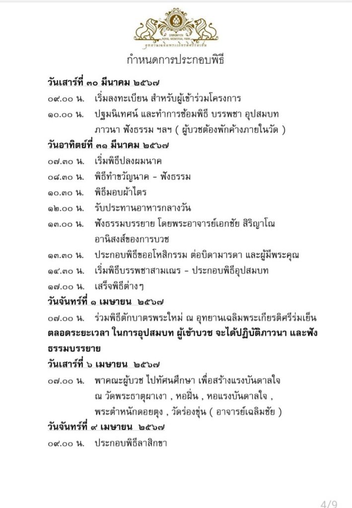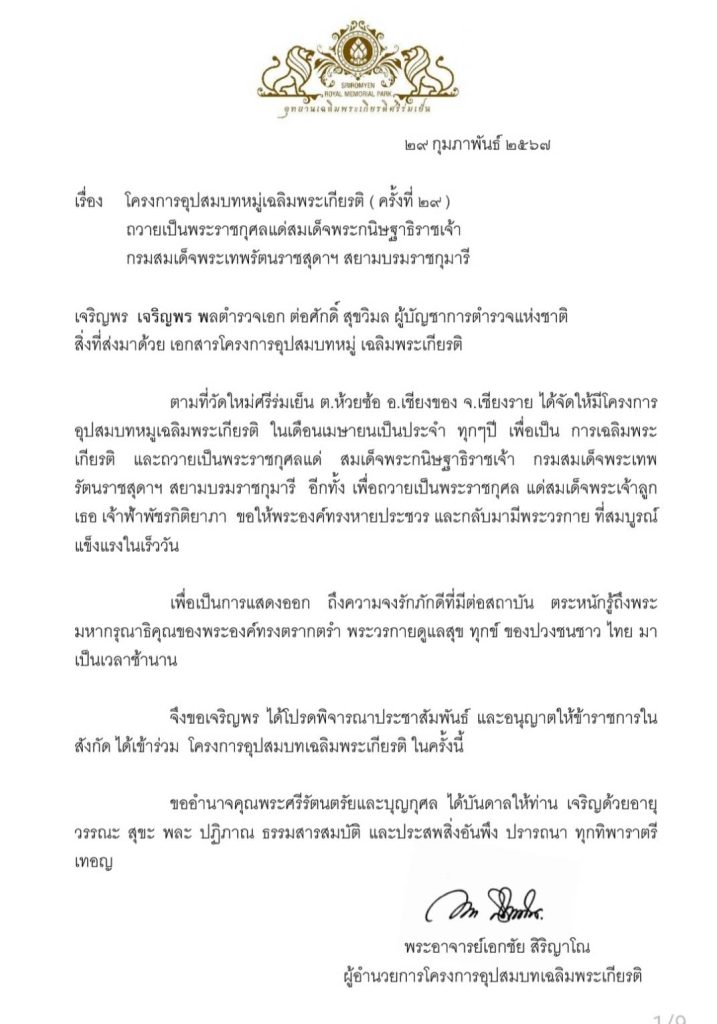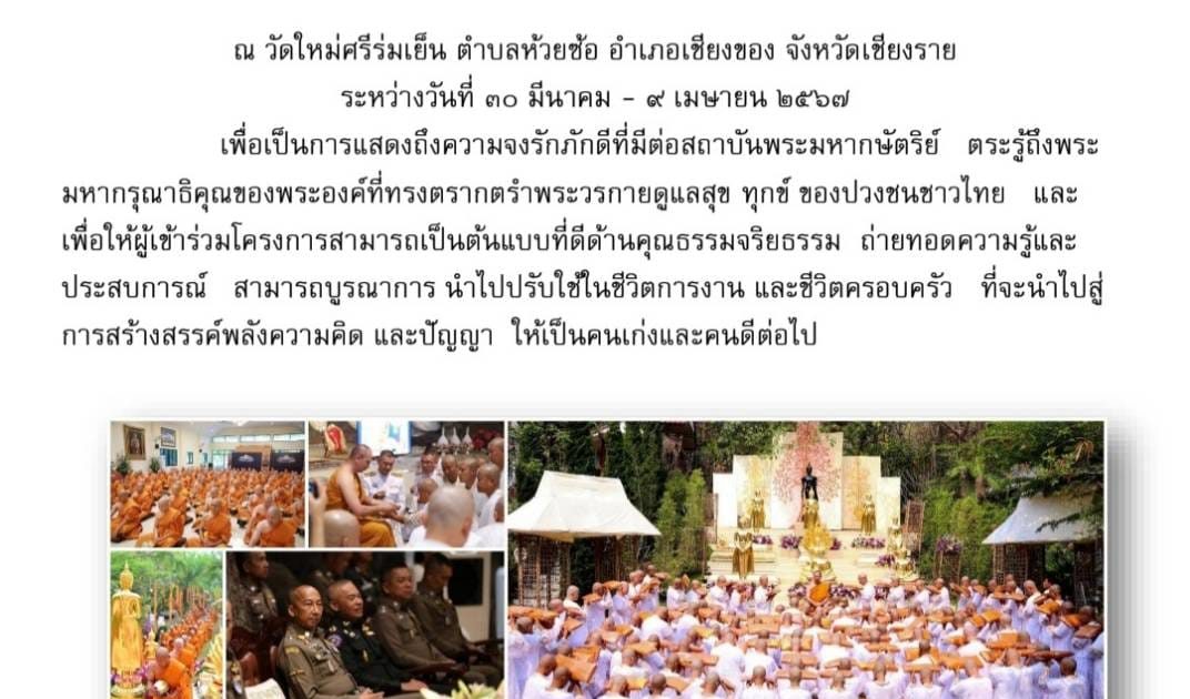 สำนักงานตำรวจแห่งชาติขอเชิญข้าราชการตำรวจพุทธศาสนิกชนชายไทย เข้าร่วมโครงการอุปสมบทหมู่เฉลิมพระเกียรติปฏิบัติธรรมภาวนา เพื่อถวายเป็นพระราชกุศลแด่สมเด็จพระกนิษฐาธิราชเจ้า กรมสมเด็จพระเทพรัตนราชสุดาฯ สยามบรมราชกุมารี เนื่องในเดือนพระราชสมภพ อีกทั้งเพื่อถวายเป็นพระราชกุศลแด่สมเด็จพระเจ้าลูกเธอ เจ้าฟ้า พัชรกิติยาภา ขอให้พระองค์ทรงหายประชวร และกลับมามีพระวรกายที่สมบูรณ์แข็งแรงในเร็ววัน ณ วัดใหม่ศรีร่มเย็น ต.ห้วยซ้อ อ.เชียงของ จ.เชียงราย ระหว่างวันที่ 30 มีนาคม – 9 เมษายน 2567