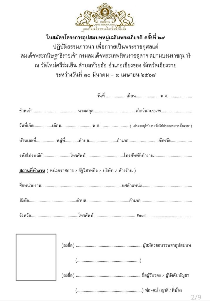สำหรับผู้ที่สนใจเข้าร่วมโครงการอุปสมบทหมู่เฉลิมพระเกียรติ กรุณาส่งใบสมัครผ่านต้นสังกัด หรือส่งอีเมล เฉพาะใบสมคัรและรูปถ่ายมาที่อีเมล siriyano1@hotmail.com หรือไอดีไลน์ yano2507 หรือ Vitcom ก่อนวันที่ 20 มีนาคม 2567