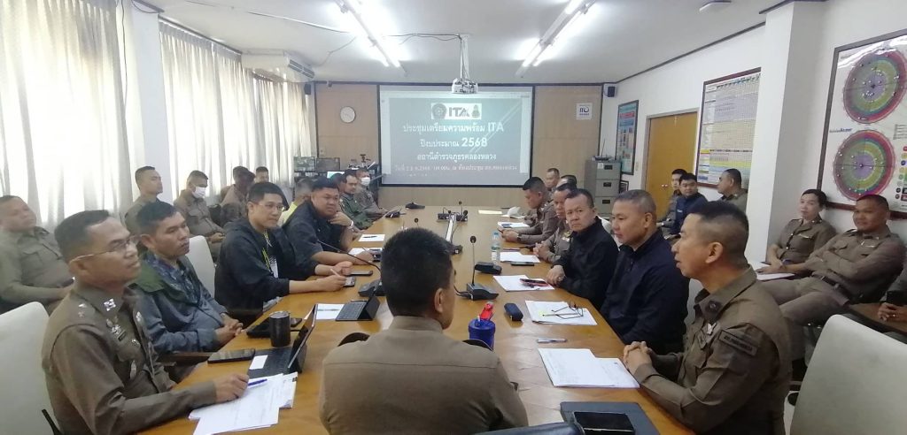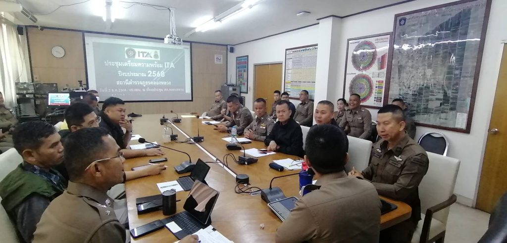 วันที่ 2 ธันวาคม พ.ศ 2567 เวลา 09.00 น. พ.ต.อ.เกียรติศักดิ์ มิตรปราสาท ผกก.สภ.คลองหลวง พ.ต.ท.ฉลาด หอมเงิน รอง ผกก.สส.สภ.คลองหลวง พ.ต.ท.สุชัย แสงส่อง รอง ผกก.สอบสวน.สภ.คลองหลวง พ.ต.ท.กวินเวทย์ วิริยะสิริภักดี รอง ผกก.ป.สภ.คลองหลวง พ.ต.ท.สิทธิศักดิ์ เตมียศิลปิน สว.อก.สภ.คลองหลวง พ.ต.ท.สิงหา เฟื่องแก้ว สว.จร.สภ.คลองหลวง พ.ต.ท.วีระ สุขชนะ สว.สส.สภ.คลองหลวง พ.ต.ท.สิรภพ บัวหลวง สว.สส.สภ.คลองหลวง พ.ต.ต.มนตรี คงอาจ สวป.สภ.คลองหลวง และเจ้าหน้าที่ผู้เกี่ยวข้อง ประชุมเตรียมความพร้อม กิจกรรม ITA 2568 ณ ห้องประชุมสภ.คลองหลวง
