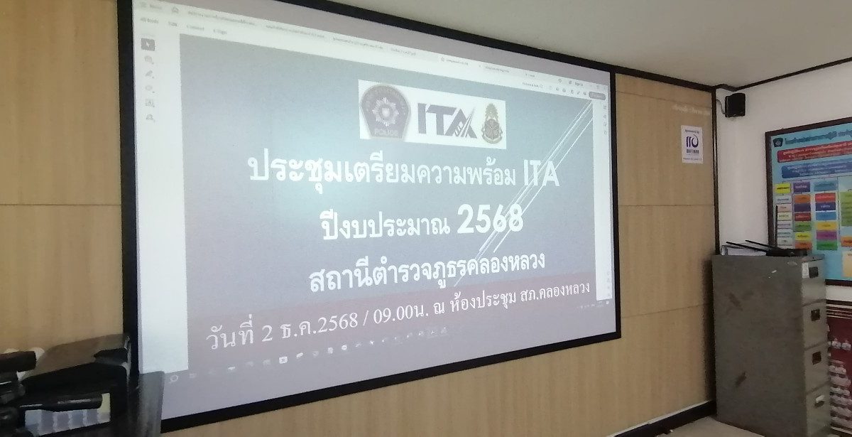 วันที่ 2 ธันวาคม พ.ศ 2567 เวลา 09.00 น. พ.ต.อ.เกียรติศักดิ์ มิตรปราสาท ผกก.สภ.คลองหลวง พ.ต.ท.ฉลาด หอมเงิน รอง ผกก.สส.สภ.คลองหลวง พ.ต.ท.สุชัย แสงส่อง รอง ผกก.สอบสวน.สภ.คลองหลวง พ.ต.ท.กวินเวทย์ วิริยะสิริภักดี รอง ผกก.ป.สภ.คลองหลวง พ.ต.ท.สิทธิศักดิ์ เตมียศิลปิน สว.อก.สภ.คลองหลวง พ.ต.ท.สิงหา เฟื่องแก้ว สว.จร.สภ.คลองหลวง พ.ต.ท.วีระ สุขชนะ สว.สส.สภ.คลองหลวง พ.ต.ท.สิรภพ บัวหลวง สว.สส.สภ.คลองหลวง พ.ต.ต.มนตรี คงอาจ สวป.สภ.คลองหลวง และเจ้าหน้าที่ผู้เกี่ยวข้อง ประชุมเตรียมความพร้อม กิจกรรม ITA 2568 ณ ห้องประชุมสภ.คลองหลวง