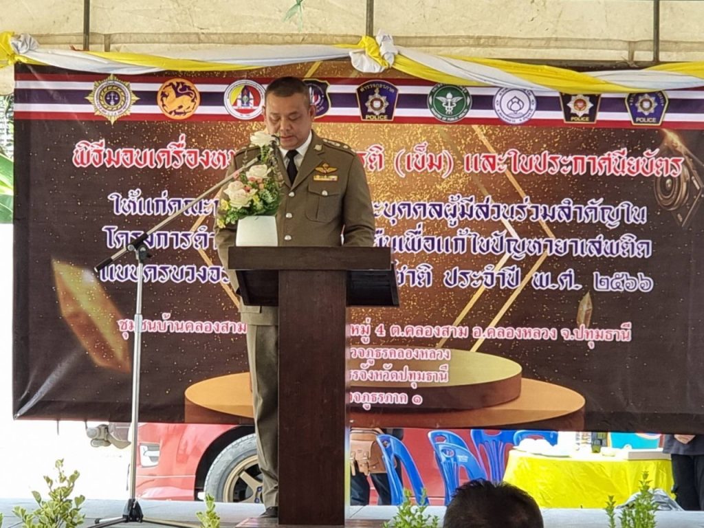 เมื่อวันที่ 17 ตุลาคม 2566 เวลา 13.00 น.รอง ผบก.ภ.จว.ปทุมธานี ทำพิธีมอบเข็มและใบประกาศ ผู้มีส่วนสำคัญในการขับเคลื่อนโครงการ ชุมชนยั่งยืนเพื่อแก้ไขปัญหายาเสพติด ตามยุทธศาสตร์ชาติณ สถานีตำรวจภูธรคลองหลวง