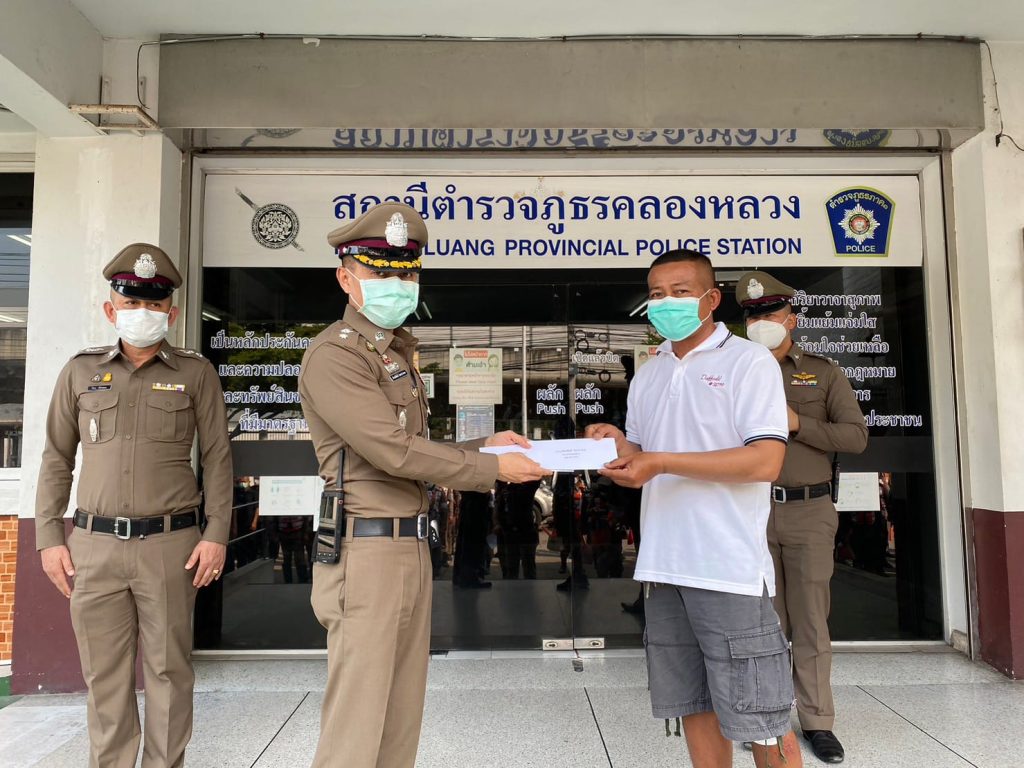 พ.ต.อ.เกียรติศักดิ์ มิตรปราสาท ผกก.สภ.คลองหลวง ได้มอบเงินช่วยเหลือเพื่อเป็นขวัญและกำลังใจในการปฏิบัติงานให้กับ ด.ต.สมพร นกสี สายตรวจรถจักรยานยนต์ตู้ยามคลองสี่ ประสบอุบัติเหตุอุบัติเหตุ รถล้ม