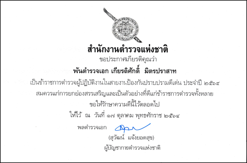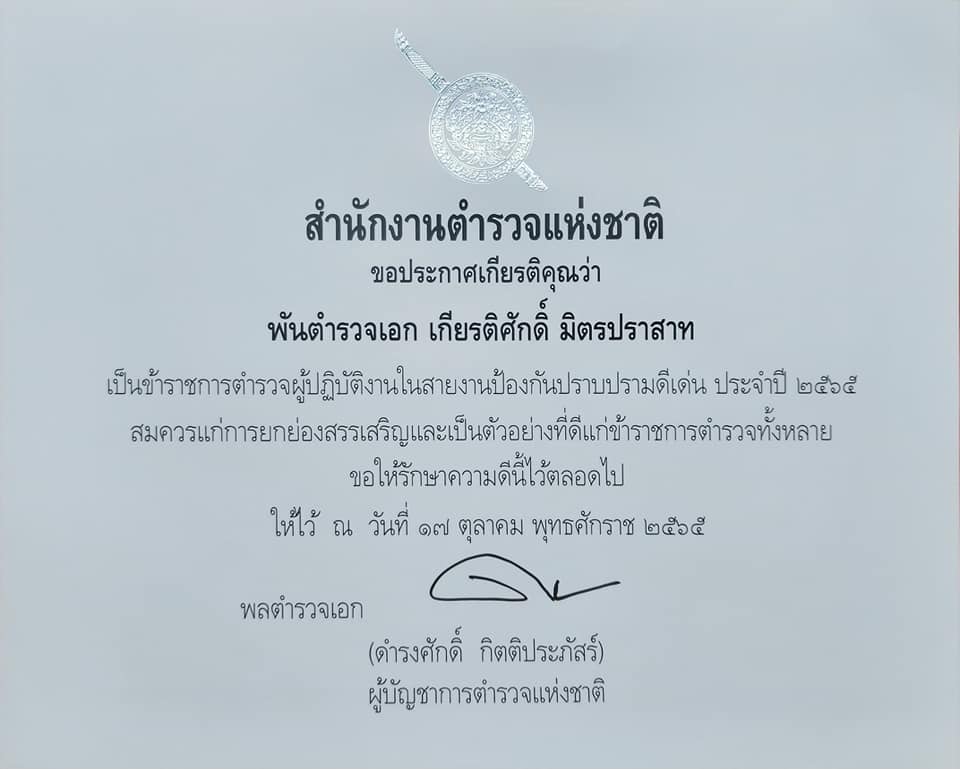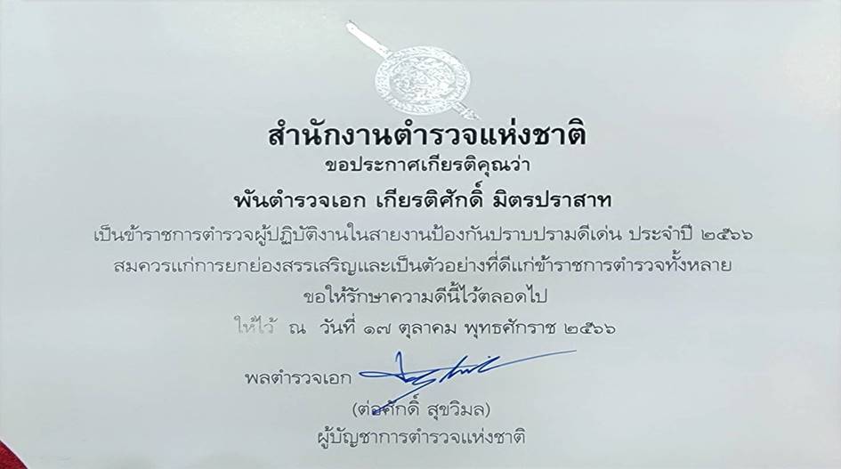 รับรางวัลข้าราชการตำรวจดีเด่นด้านงานป้องกันและปราบปราม ของ