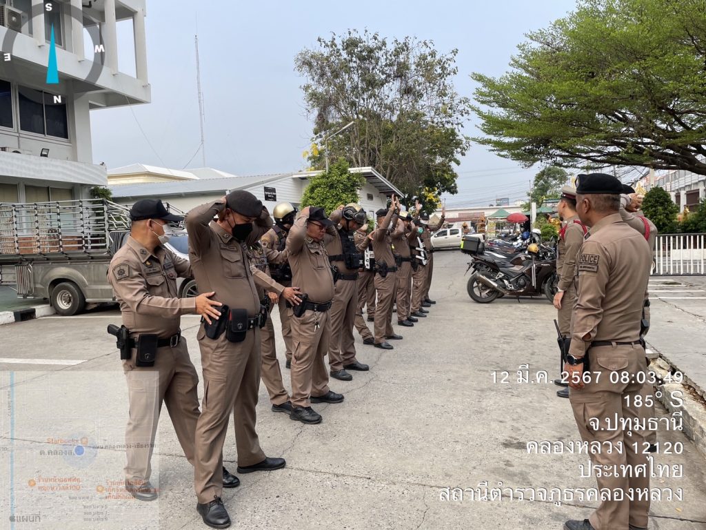 นำแถวเคารพธงชาติอบรมปล่อยแถวสายตรวจเดินเท้า/สายตรวจตู้ยาม/สายตรวจรถจักรยานยนต์ ชุดที่ 3 ผลัดเวลา (08.00น-16.00น.) บริเวณ หน้าสภ.คลองหลวง