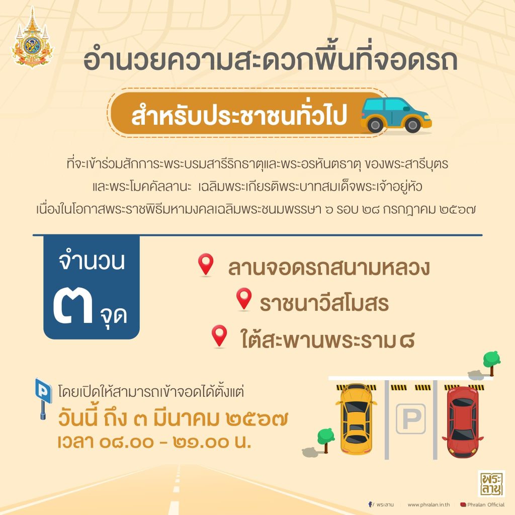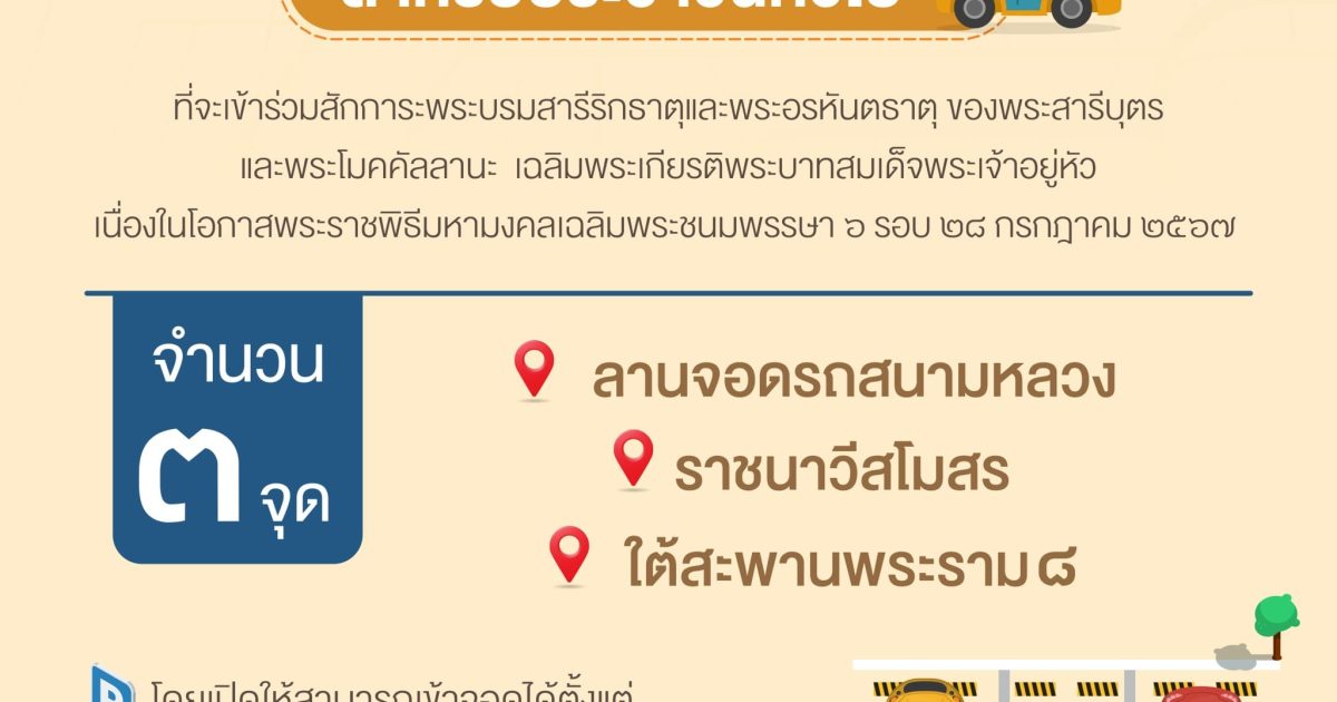 อำนวยความสะดวกพื้นที่จอดรถสำหรับประชาชนทั่วไปที่จะเข้าร่วมสักการะพระบรมสารีริกธาตุ และพระอรหันตธาตุของพระสารีบุตรและพระโมคคัลลานะ เฉลิมพระเกียรติพระบาทสมเด็จพระเจ้าอยู่หัว เนื่องในโอกาสพระราชพิธีมหามงคลเฉลิมพระชนมพรรษา ๖ รอบ ๒๘ กรกฎาคม ๒๕๖๗