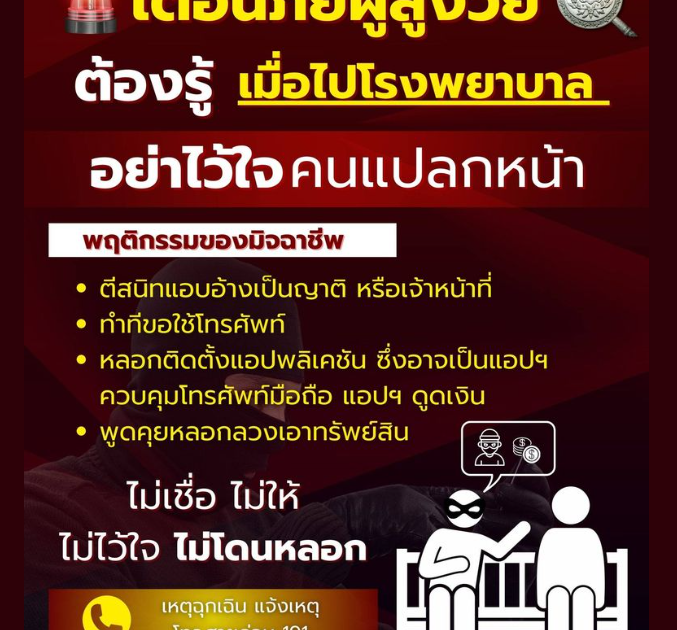 เมื่อท่านไปในที่สาธารณะ เช่น โรงพยาบาล หน่วยงานราชการต่าง ๆ ที่มีผู้คนไปใช้บริการจำนวนมาก แม้เป็นสถานที่ปลอดภัย แต่ก็อาจมีมิจฉาชีพแฝงตัวมา