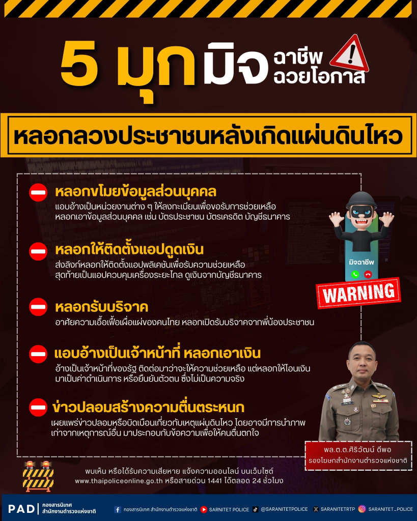 สำนักงานตำรวจแห่งชาติ เตือน 5 มุกมิจฉาชีพ ฉวยโอกาสแผ่นดินไหว ซ้ำเติมประชาชน