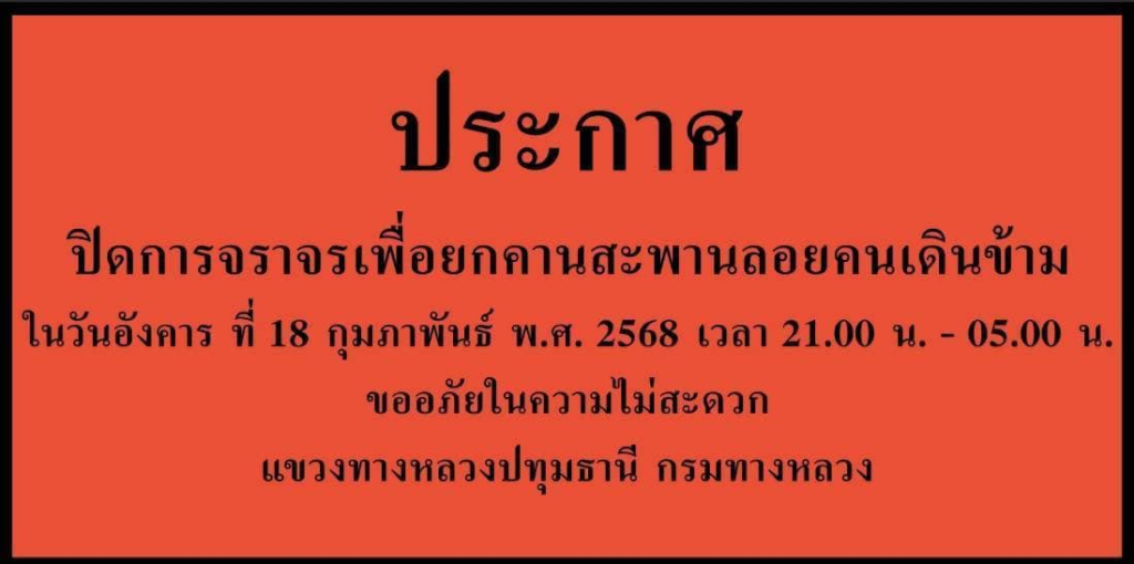 จึงแจ้งประชาสัมพันธ์ให้ผู้ใช้เส้นทางโปรดหลีกเลี่ยงการจราจรบริเวณถนนเชียงราก ทั้งฝั่งขาเข้าและขาออกในวันและเวลาดังกล่าว