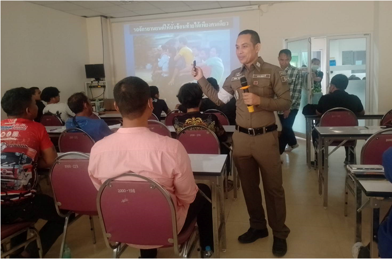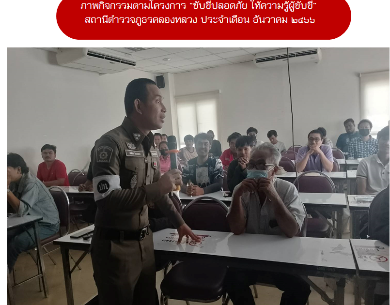โครงการ “ขับขี่ปลอดภัย ให้ความรู้ผู้ขับขี่”วันที่ ๑๙ ธ.ค.๖๖ เวลา ๐๙.๐๐ – ๑๑.๐๐ น. พ.ต.อ.เกียรติศักดิ์ มิตรปราสาท ผกก.สภ.คลองหลวง,พ.ต.ท.สิงหา เฟื่องแก้ว สว.จร.สภ.คลองหลวง ได้มอบหมายให้ ร.ต.อ. สมโภช จำนวนนา รอง สว.จร.สภ.คลองหลวง เป็นวิทยากร อบรมให้ความรู้ด้านการจราจร การขับขี่ปลอดภัย สวมหมวกนิรภัย ๑๐๐ เปอร์เซ็นต์ ให้กับกลุ่มประชาชนที่ยื่นเรื่องเข้าอบรมและทดสอบเพื่อขอรับใบอนุญาตขับขี่ ณ สำนักงานขนส่งจังหวัดปทุมธานี เพื่อป้องกัน และลดอุบัติเหตุทางถนนที่เกิดขึ้นในพื้นที่ ตามโครงการ“ขับขี่ปลอดภัย ให้ความรู้ผู้ขับขี่” ของ สภ.ฯ