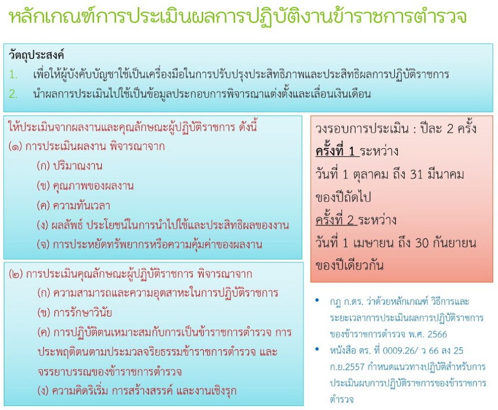 - กฎ ก.ตร. ว่าด้วยหลักเกณฑ์ วิธีการและระยะเวลาการประเมินผลการปฏิบัติราชการของข้าราชการตำรวจ พ.ศ.2566