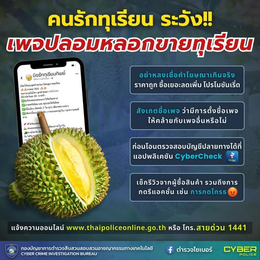 คนรักทุเรียนโปรดระวัง! เพจปลอมหลอกขายทุเรียน . เข้าสู่ช่วงเทศกาลผลไม้เมืองร้อน “ทุเรียน” ผลไม้ยอดนิย