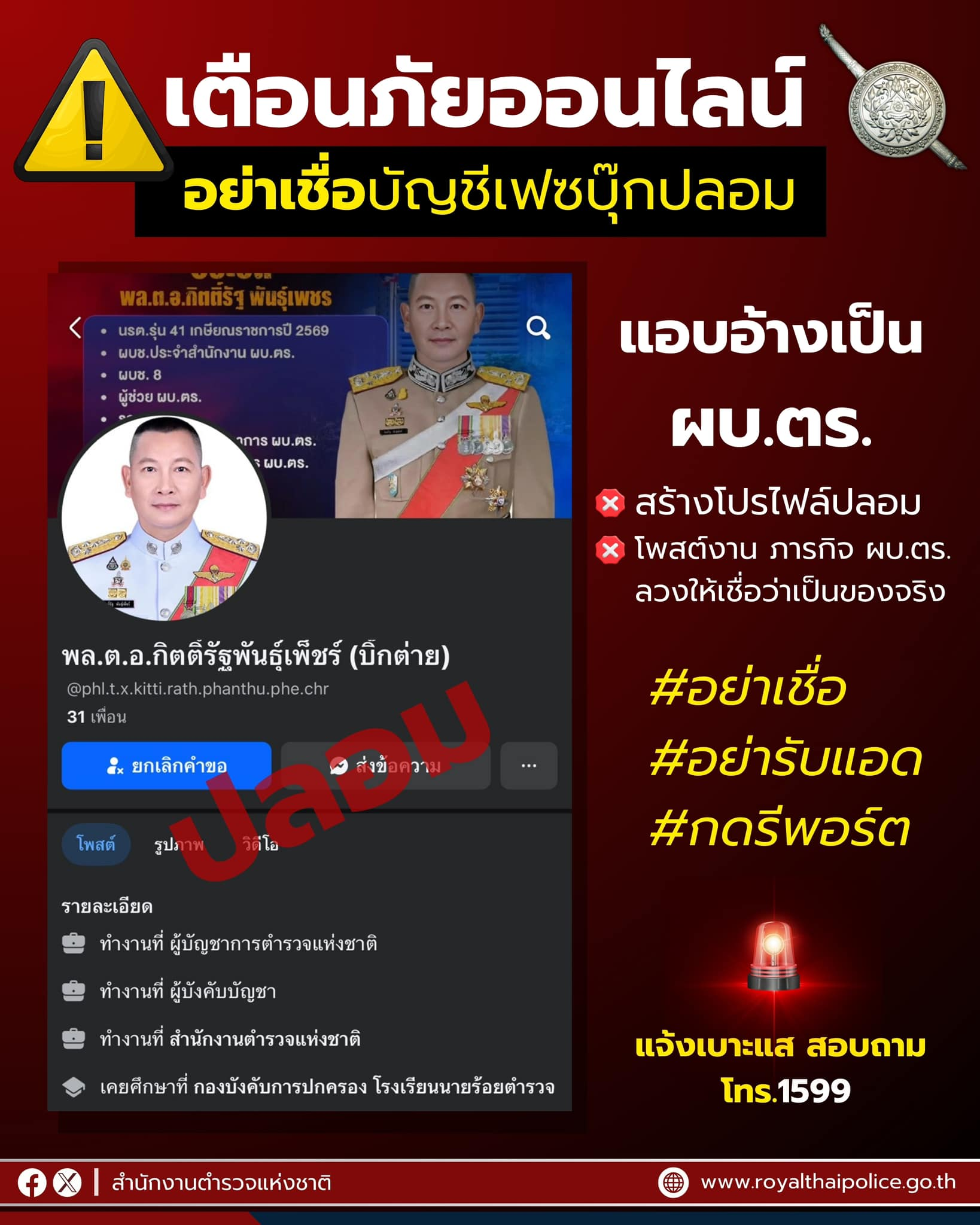 อย่าเชื่อ อย่ารับแอด กดรีพอร์ต “บัญชีเฟซบุ๊กปลอม” แอบอ้าง เป็น ผบ.ตร. สร้างโปรไฟล์ปลอม โพสต์ งาน ภาพ