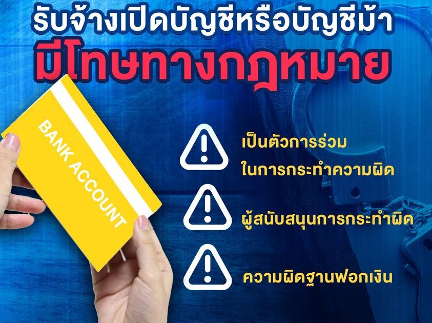 ปัจจุบันมีบัญชีม้าเกิดขึ้นมากมาย เพื่อถูกใช้เป็นช่องทางการโอนผ่านเงินของเหล่ามิจฉาชีพ ในการทำอาชญากรรมทางการเงินต่างๆ โดยในบางกรณีผู้เสียหายหรือตัวเจ้าของบัญชีเองนั้น อาจรู้ไม่เท่าทันว่ากำลังถูกหลอก ว่าการรับจ้างเปิดบัญชีธนาคาร หรือมอบบัญชีธนาคารของตนเองให้กับผู้อื่นอาจถูกดำเนินคดีตามฎหมายได้ ดังนี้