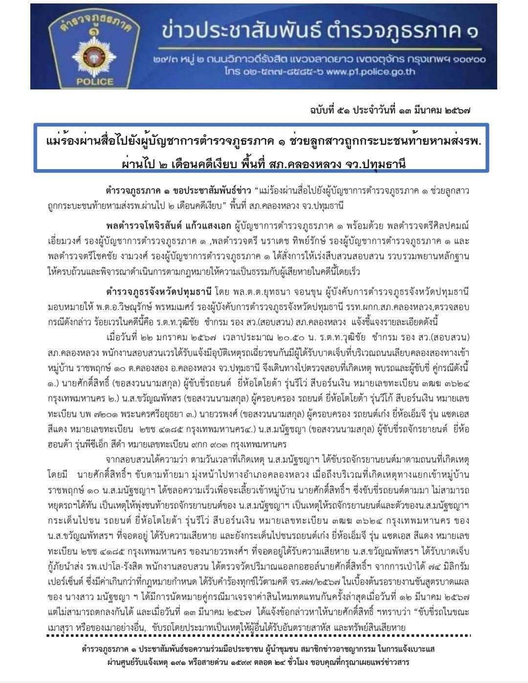ตำรวจภูธรภาค ๑ ขอประชาสัมพันธ์ข่าว “แม่ร้องผ่านสื่อไปยังผู้บัญชาการตำรวจภูธรภาค 1 ช่วยลูกสาวถูกกระบะ