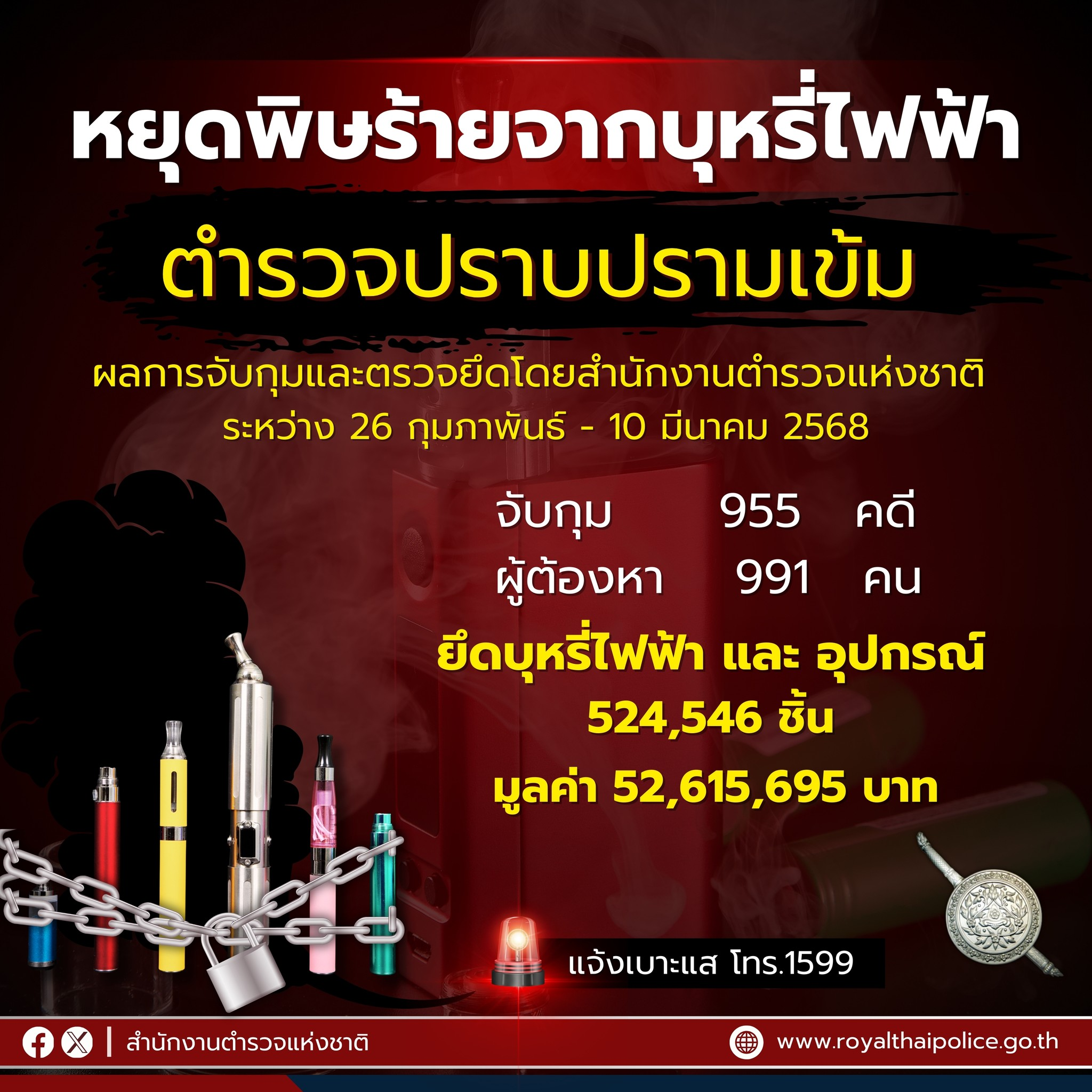 หยุดพิษร้ายจากบุหรี่ไฟฟ้า สำนักงานตำรวจแห่งชาติปราบปรามเข้ม จับกุมตรวจยึดอย่างต่อเนื่อง กว่า 2 สัปดา