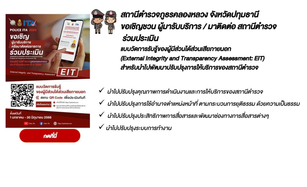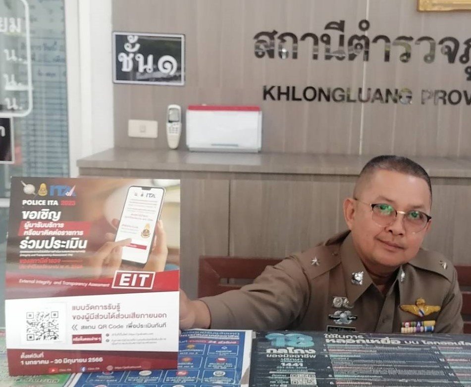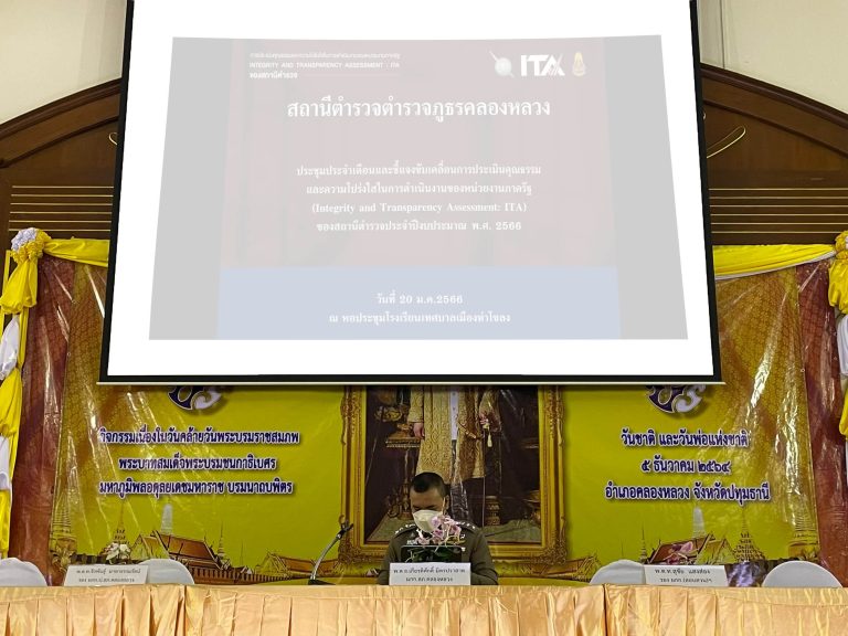 สถานีตำรวจภูธรคลองหลวง ได้ดำเนินการประชุมการขับเคลื่อนการประเมินคุณธรรมและความโปร่งใสในการดำเนินงานของหน่วยงานภาครัฐ(Integrity and Transparency Assessment: ITA)ของสถานีตำรวจ ประจำปีงบประมาณ พ.ศ. 2566